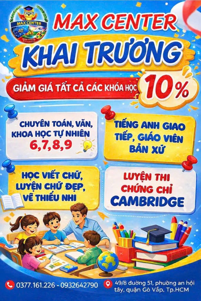 Với đội ngũ giáo viên tận tâm và môi trường học tập thân thiện, Max Center luôn đồng hành cùng học viên trên hành trình chinh phục tri thức và phát triển bản thân. ✨